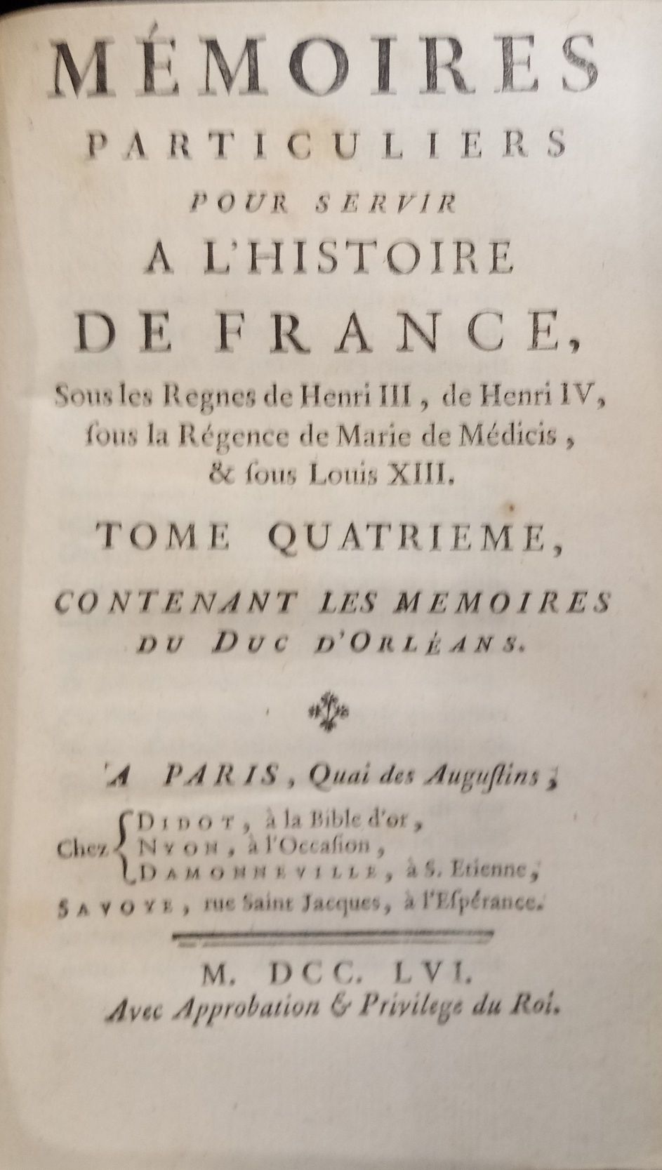 Mémoires Particuliers Pour Servir À L’Histoire De France. Sous les Regnes de Henri III, de Henri IV, sous la Régence de Marie de Médicis, & sous Louis XIII. Tome Quatrieme, contenant les memoires du Duc d’Orleans.1756 BT: 5271 Standort: Breslau - Universitätsbibliothek Wrocław Signatur: 038063