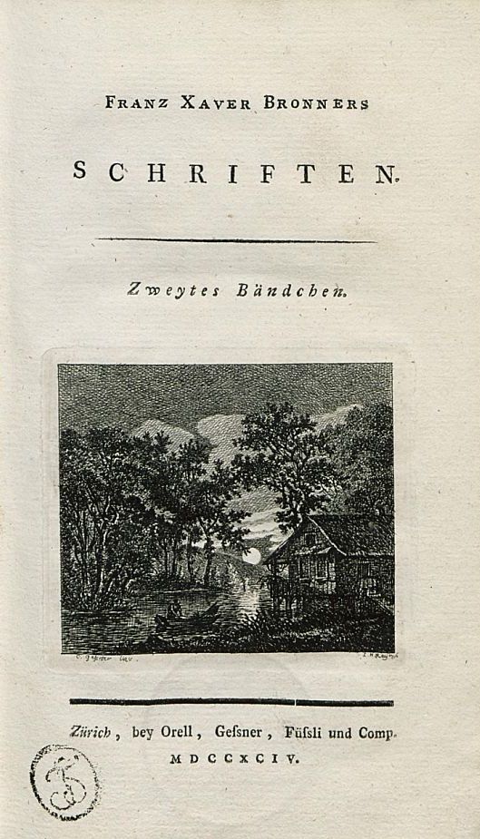 Schriften. Drittes Bändchen: Frühere Fischergedichte Und Erzæhlungen Von F. X. Bronner. Mit neuen Gedichten vermehrte und durchaus verbesserte Ausgabe.1794 BT: 4898 Standort: Berlin - Staatsbibliothek zu Berlin Signatur: Ym 4986-3<a>