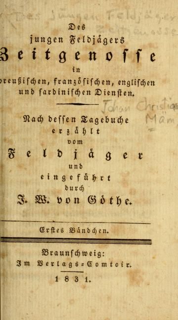 Des jungen Feldjägers Zeitgenosse in preussischen, französischen, englischen und sardinischen Diensten. Nach dessen Tagebuche erzählt vom Feldjäger und eingeführt von J.W. von Goethe.1831 BT: 483 Standort: London - British Library Signatur: 10706.a.21.