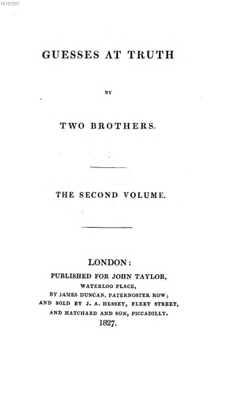 Guesses at truth by two brothers. The first volume.1827 BT: 1874 Standort: München - Bayerische Staatsbibliothek (BSB) Signatur: Ph.u. 230 f-1