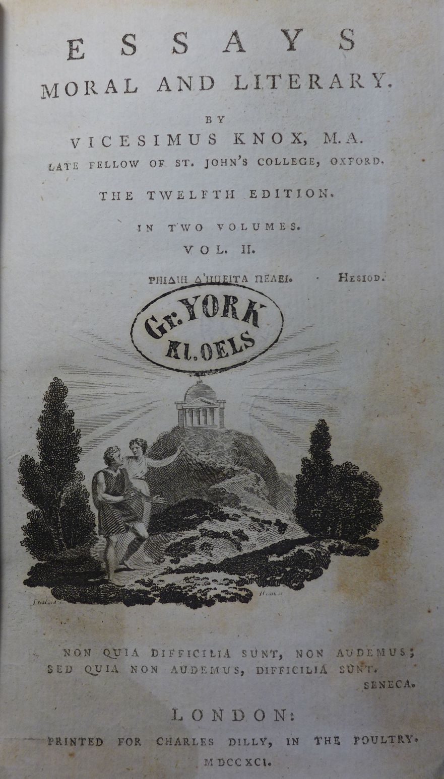Essays moral and literary.1791 BT: 1953 Standort: Breslau - Universitätsbibliothek Wrocław Signatur: 035602