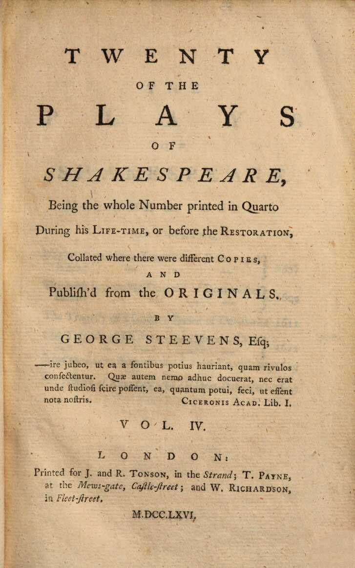 Twenty of the plays of Shakespeare. Being the whole Number printed in Quarto During his Life-Time, or before the Restoration, Collated where there were different Copies and Publish’d from the Originals.1766 BT: 2149 Standort: Wien – Österreichische Nationalbibliothek (ÖNB) Signatur: 23715-B.4