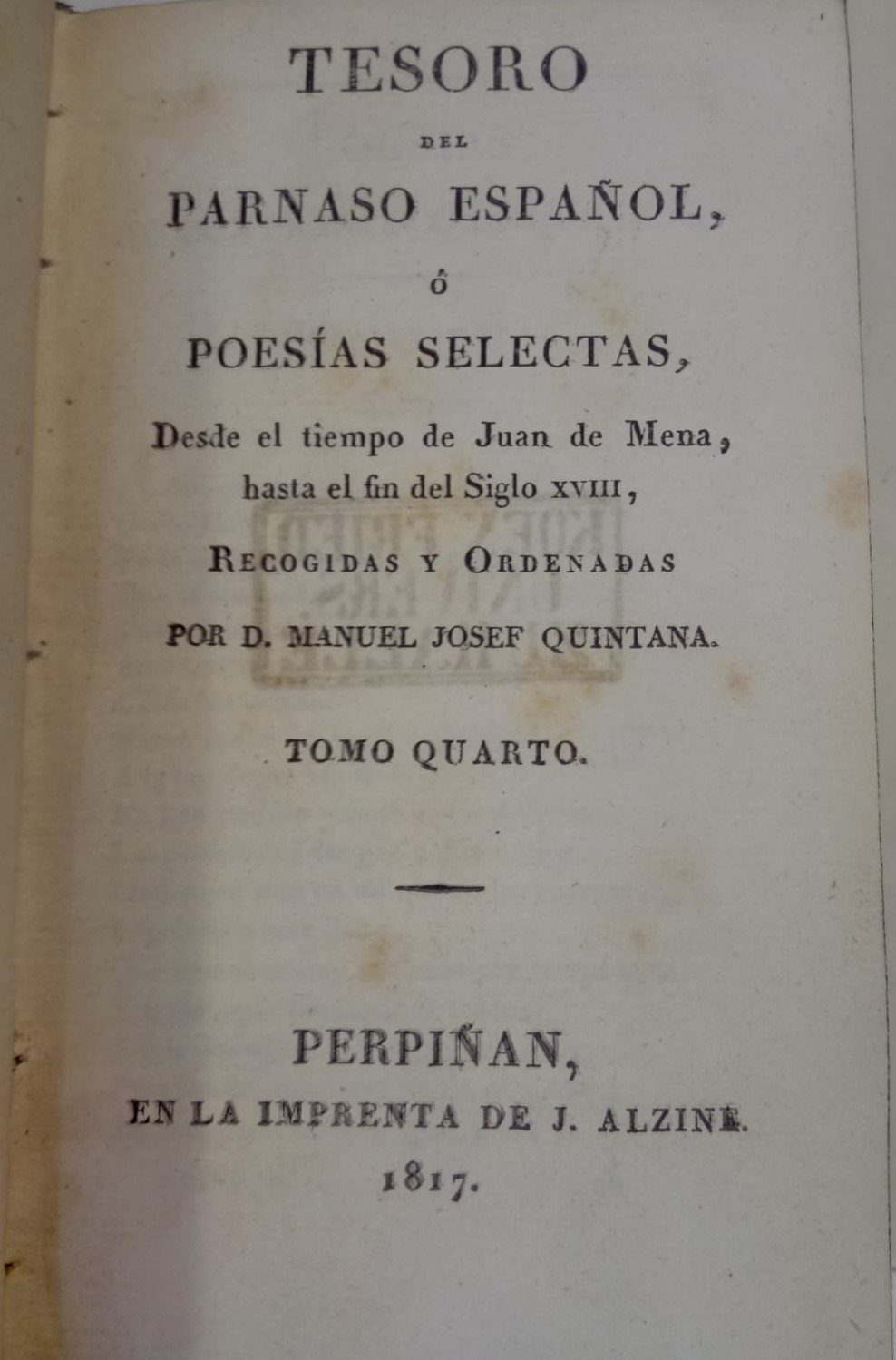 Tesoro del Parnaso Español, ó Poesías Selectas. Desde el tiempo de Juan de Mena, hasta el fin del Siglo XVIII.1817 BT: 2722 Standort: Halle - Universitäts- und Landesbibliothek Halle Signatur: Dk 815 (1)